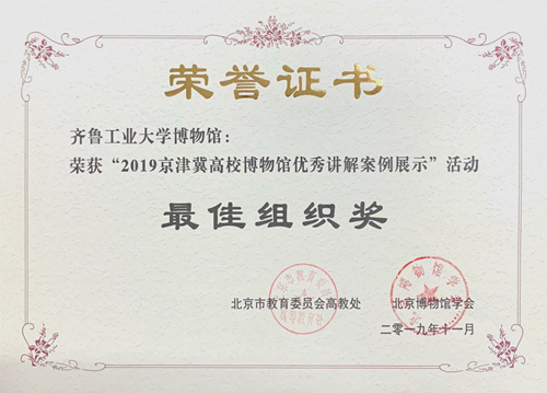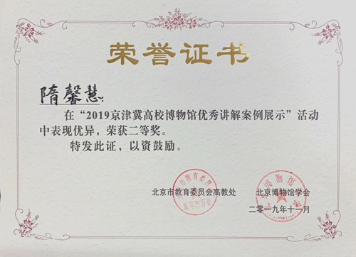 本次活动由中国博物馆协会,北京市教育委员会,北京市文物局,北京博物馆学会指导,京津冀高校博物馆联盟,北京高校博物馆联盟,北京高校博物馆专业委员会共同主办,活动自10月初在中国传媒大学正式启动,共有来自全国30余所高校博物馆的100余名讲解员入围本届活动初赛,经过专家点评,评委评选,最终有37件优秀作品进入复赛,校(院)博物馆选送的3名作品从讲解水平,稿件撰写,视频录制等方面均表现出较高水平,得到组委会的高度认可 91香蕉,最终,初次参赛并获得“最佳组织奖”荣誉称号,讲解员隋馨慧同学获得二等奖。