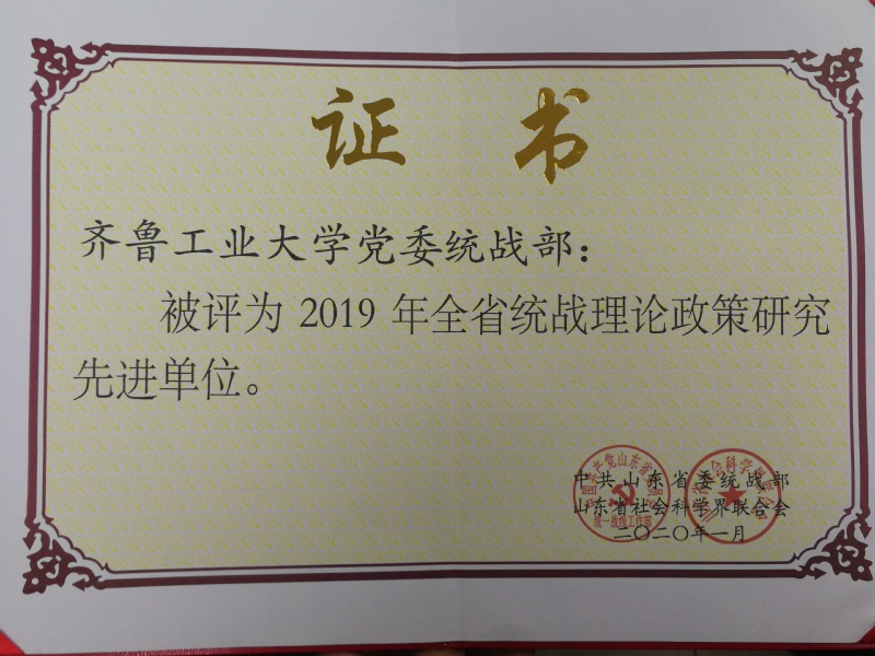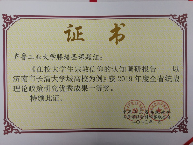 由中共山东省委统战部 91香蕉视频,山东省社会科学界联合会组织开展的2019年度全省统战调研宣传工作优秀成果和先进单位评选活动中,齐鲁工业大学(山东省科学院)党委统战部被评为“全省统战理论政策研究先进单位”,滕培胜课题组撰写的《在校大学生宗教信仰的认知调研报告——以济南市长清大学城高校为例》荣获全省统战理论政策研究成果一等奖。