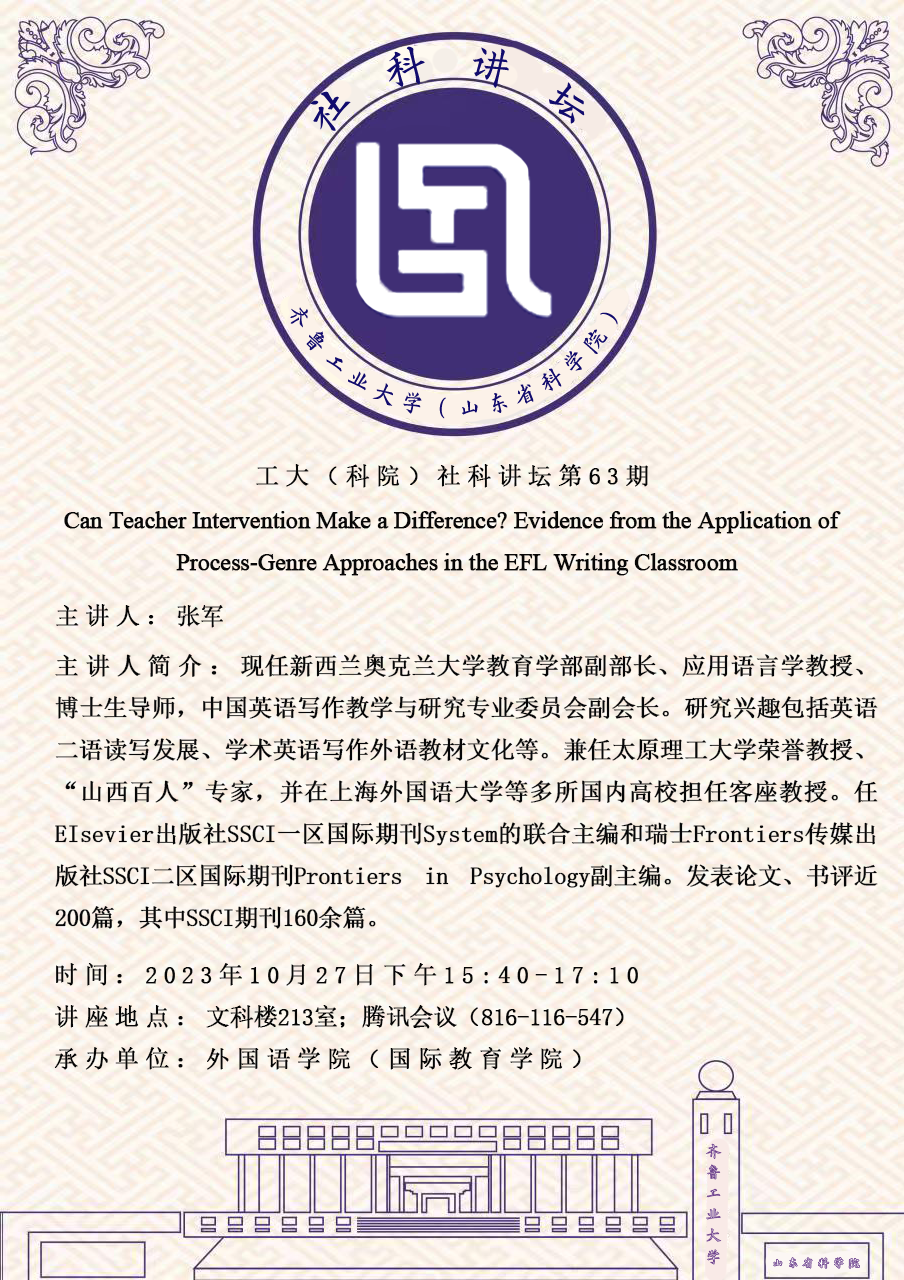 工大(科院)社科讲坛第63期:Can Teacher Interwention Make a Difference?Evidence from the Applicatiom of Process-Genre Approaches in the EFL Writing Classroom