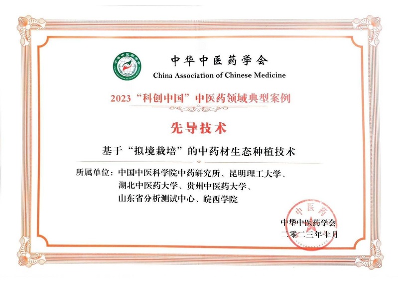 由中国中医科学院中药研究所,昆明理工大学,湖北中医药大学,贵州中医药大学,山东省分析测试中心和皖西学院联合构建的基于“拟境栽培”的中药材生态种植技术入选2023“科创中国”中医药领域典型案例先导技术 91香蕉,该技术针对化学农业带来的中药材质量安全及环境安全问题,提出并践行“不向农田抢地,不与草虫为敌,不惧山高林密,不负山青水绿”的中药生态农业宣言,首次提出并丰富了基于“逆境效应”的中药材“拟境栽培”生态种植理论,构建了质量优先的中药材生态种植评估指标体系,化药学部,测试中心主任王晓研究员及团队依托“十三五”国家重点研发计划课题完成了该先导技术中金银花,瓜蒌和丹参等山东道地药材生态种植模式及配套技术的研究工作,并依托国家中药材产业技术体系济南综合试验站进行了示范推广,取得了显著成效。
