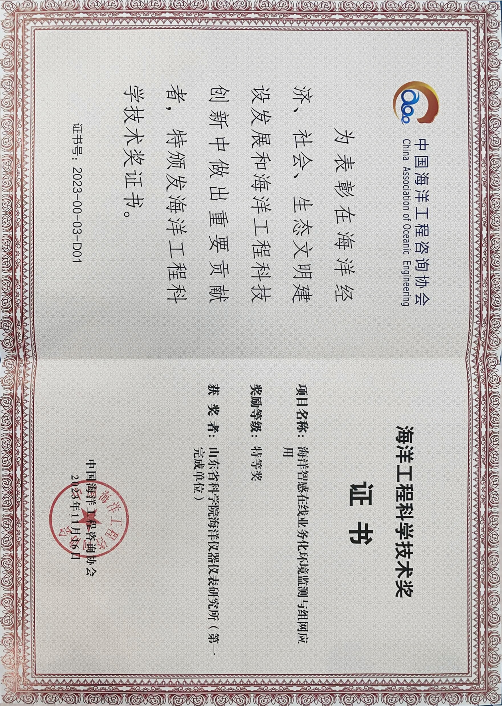 11月23日,2023年度海洋工程科学技术奖颁奖大会暨海洋经济创新发展大会在深圳举行 91香蕉视频,齐鲁工业大学(山东省科学院)“海洋智感在线业务化环境监测与组网应用”项目荣获海洋工程科学技术奖特等奖。