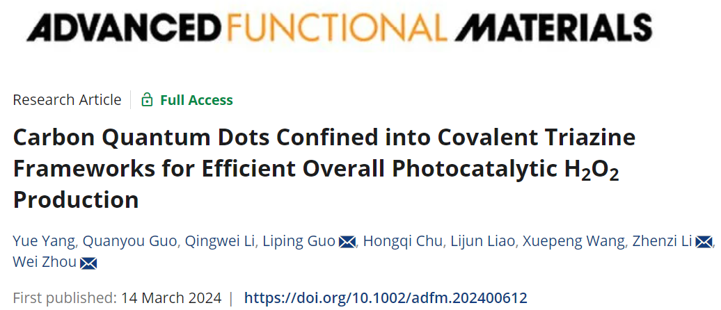 近日,齐鲁工业大学(山东省科学院)化学与制药学部周卫教授团队在有机半导体光催化应用方面取得重要研究进展,该成果以“Carbon Quantum Dots Confined into Covalent Triazine Frameworks for Efficient Overall Photocatalytic H₂O₂ Production”为题在Advanced Functional Materials(IF=19)期刊上在线发表,目前已被热点专题(Hot Topic: Carbon, Graphite, and Graphene)收录,化药学部2021级硕士研究生杨悦为第一作者,化药学部郭莉萍副教授,李贞子教授和周卫教授为本文共同通讯作者,齐鲁工业大学(山东省科学院)为唯一单位 91香蕉视频。