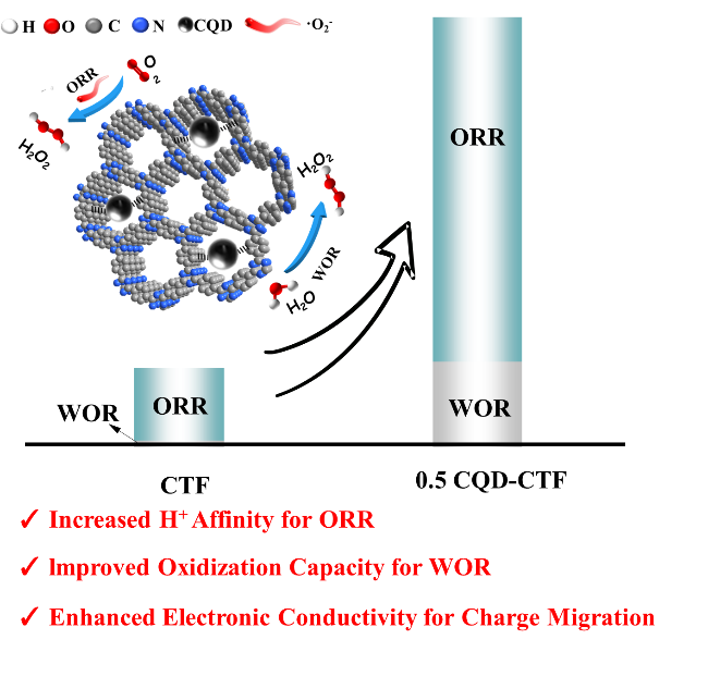 多孔有机聚合物具有结构组成多样、分子设计目的性强等优点,在光催化领域有良好的应用前景。然而有机半导体固有的高阻抗和低导电性限制了电荷转移效率,从而降低了光催化性能。基于上述问题,本工作将碳量子点(CQDs) 通过化学键合锚定在共价三嗪框架(CTF)孔道内部,CQDs作为良好的电子传输介质,从而提升CTF本体的电导率。结果显示CQDs (0,5 wt %)的加入可以使CTF的电子电导率提高10倍,因此该复合材料呈现高的电荷分离和转移效率。此外,CQDs的嵌入明显地提升亲H⁺能力,从而增加产H₂O₂中的氧还原(ORR)路径的效率;不仅如此,CQDs的存在能够明显地增强材料的氧化能力,从而提升产H₂O₂中的水氧化(WOR)路径的效率。因此在纯水中无任何牺牲剂存在的情况下,0,5% CQD-CTF在可见光照射下,H₂O₂生成速率高达1036μmolg⁻¹h⁻¹,是原始CTF性能的4 91香蕉,6倍。该工作为有机半导体高效生产H₂O₂提供了新思路。本工作受到国家自然科学基金、山东省泰山学者计划、山东省高等学校“青创人才引育计划”等基金的支持。。