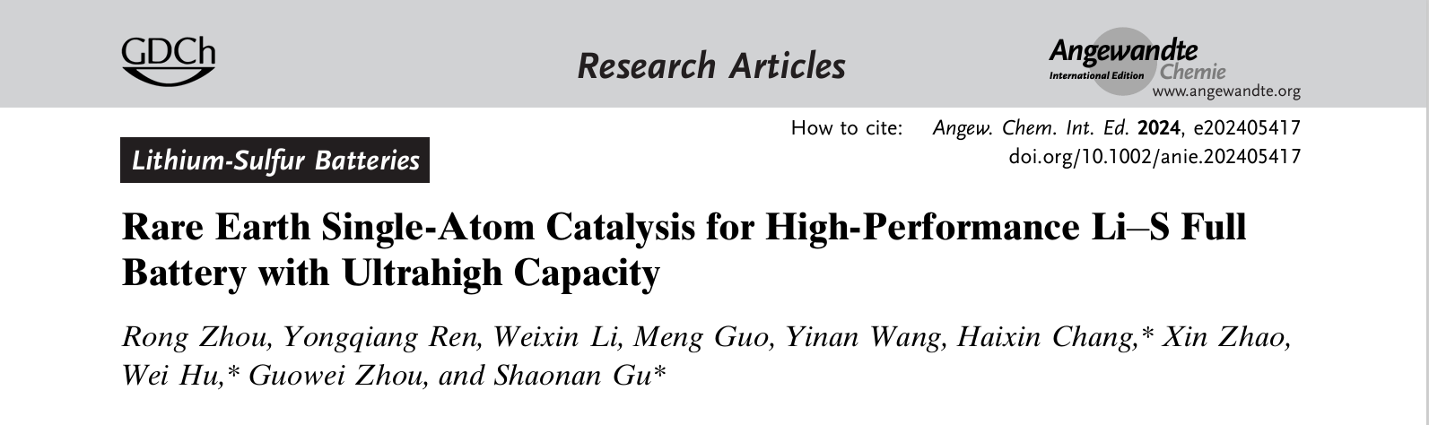 近日,齐鲁工业大学(山东省科学院)化学与制药学部顾少楠副教授在锂硫电池领域取得重要进展,该成果以“Rare Earth Single-Atom Catalysis for High-Performance Li−S Full Battery with Ultrahigh Capacity”为题在国际知名期刊Angewandte Chemie International Edition上发表,2022级研究生周蓉为论文第一作者 91香蕉视频,学部顾少楠副教授,胡伟教授和华中科技大学常海欣教授为论文的共同通讯作者,齐鲁工业大学(山东省科学院)为第一通讯单位。