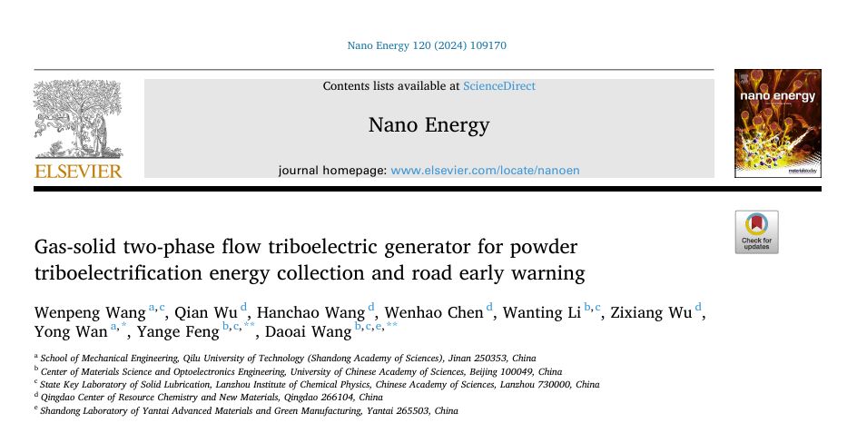 近日,机械工程学部特种润滑材料团队与中科院兰州化学物理研究所固体润滑国家重点实验室摩擦与物理传感课题组合作,在《Nano energy》(中科院一区,TOP期刊,影响因子17,6)上,发表了粉末摩擦带电机理方面的研究成果“Gas-solid two-phase flow triboelectric generator for powder triboelectrification energy collection and road early warning”,齐鲁工业大学(山东省科学院)为文章的第一单位,机械工程学部2021级研究生王文鹏为文章的第一作者。 91香蕉视频。