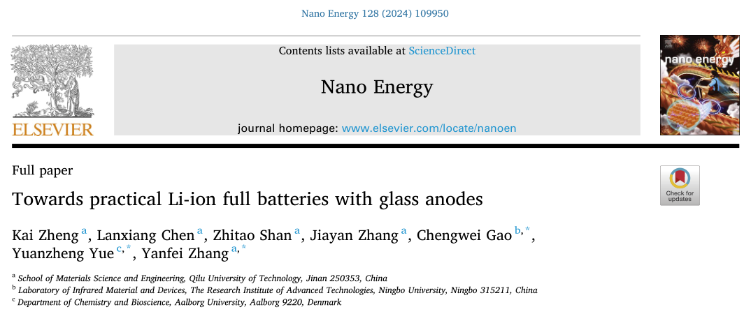 相关成果以“Towards practical Li-ion full batteries with glass anodes”为题近日在国际能源刊物《Nano Energy》(中科院I区,TOP期刊,IF:16 91看片,8)上在线发表。材料学部2022级硕士生郑凯为第一作者,学部张艳飞教授、宁波大学高成伟副教授和丹麦奥尔堡大学岳远征教授为共同通讯作者。该研究得到山东省泰山学者青年专家项目、济南市人才发展专项、国家自然科学基金和山东省自然科学基金等项目的支持。。