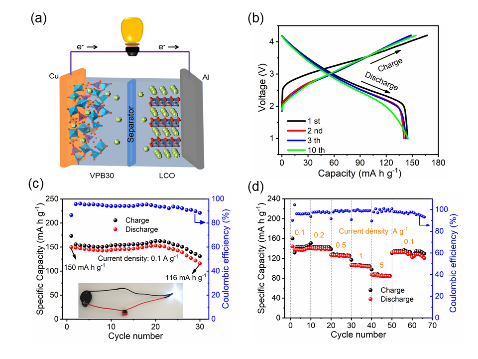 近日,学部先进玻璃材料团队将玻璃负极应用在锂离子全电池中取得实用化突破。团队利用传统熔融冷却法制备了一种新型锂离子电池负极材料—50V2O5-(50-x)P2O5-xB2O3玻璃(简称VPB),一系列电化学测试表明50V2O5-20P2O5-30B2O3(VPB30)玻璃负极具有优异的循环稳定性和倍率性能。首次利用氧化物玻璃作负极,钴酸锂作正极通过液态电解质组装了全电池,该全电池表现出令人鼓舞的整体性能,其在0,1 A g–1电流密度下的放电容量可达150 91黄,0 mA h g–1,循环性能稳定。在150 W kg-1 的功率密度下实现了222,5 Wh kg-1的能量密度,并且在5050 W kg-1的高功率密度下提供了86 Wh kg-1的能量密度,证明了玻璃材料在锂离子电池实际应用中的巨大潜力。本工作不仅为高性能锂离子电池的进一步发展提供了新思路,也为第一次向玻璃负极在锂离子全电池中的实际应用和商业化迈进了重要一步。。