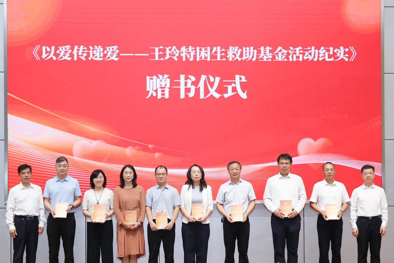 吴衍涛为王玲老师赠送鲜花并颁发纪念品,许崇海 91香蕉,吴笑兵向多年来关心和支持基金发展的各界人士赠送《以爱传递爱——王玲特困生救助基金活动纪实》书籍。