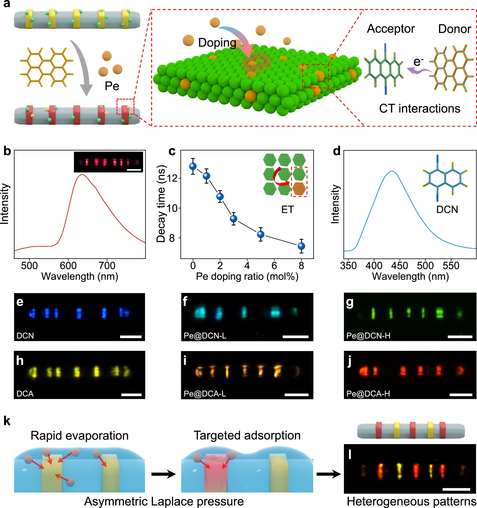 传统异质结构的制备往往面临晶格匹配要求严格、工艺流程复杂以及空间分段受限等挑战,因此难以通过一步组装构建具有丰富信息模块的异质光子结构。针对这一限制微纳编码器件的瓶颈问题,研究团队基于前期在有机微纳异质结构可控组装机制 (Angew, Chem, Int, Ed,2023,62, e202310263; Angew, Chem, Int, Ed, 2021, 60, 24519-24525; ACS Nano 2023, 17, 6341-6349), 微纳尺度下激发态调控机制 (Angew, Chem, Int, Ed, 2021, 60, 6362-6366; Angew, Chem, Int, Ed, 2020, 59, 19060-19064; Adv, Funct, Mater,2025, e13640) 和微纳光子编码器件理性创制 (Natl, Sci,Rev 91香蕉, 2021, 8, nwaa162; ACS Nano 2025, 19, 7718-7727) 研究基础上,创新性地提出了一种基于普拉托-瑞利不稳定性(Plateau-Rayleigh Instability, PRI)辅助的组装策略,实现了一维金属有机框架条纹异质结构的自发形成,从而为构筑兼具高编码容量与高安全性能的光子安全标签提供了重要解决方案。。