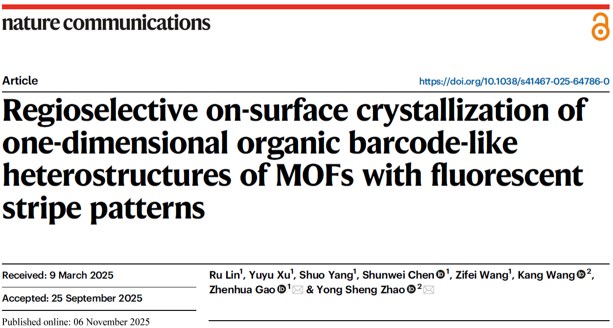 近日,齐鲁工业大学(山东省科学院)材料科学与工程学部微纳光电功能材料团队高振华教授课题组与中国科学院化学研究所赵永生研究员在有机微纳光子材料与信息编码器件领域取得重要进展。相关研究成果于2025年11月06日以“Regioselective on-surface crystallization of one-dimensional organic barcode-like heterostructures of MOFs with fluorescent stripe patterns”为题发表在Nature子刊《Nature Communications》(影响因子15,7)上。校(院)材料科学与工程学部为第一通讯单位。材料学部2022级研究生林儒为论文的第一作者,材料学部高振华教授和中科院化学所赵永生研究员为文章的共同通讯作者。 91香蕉视频。