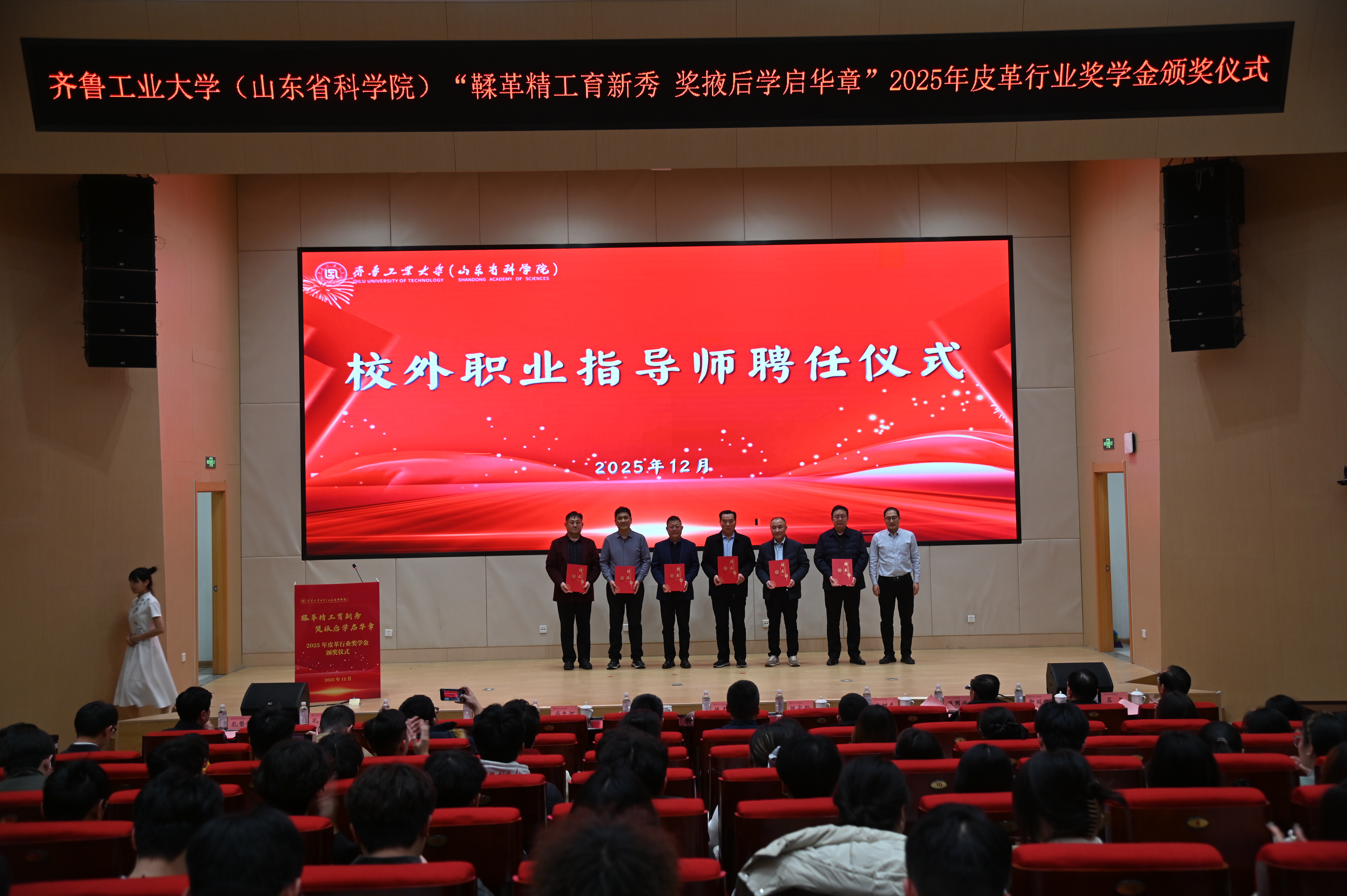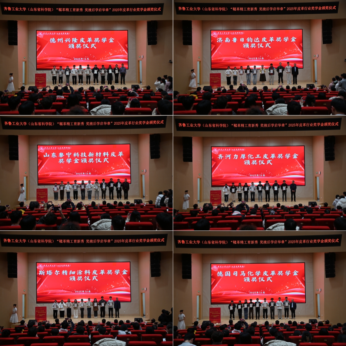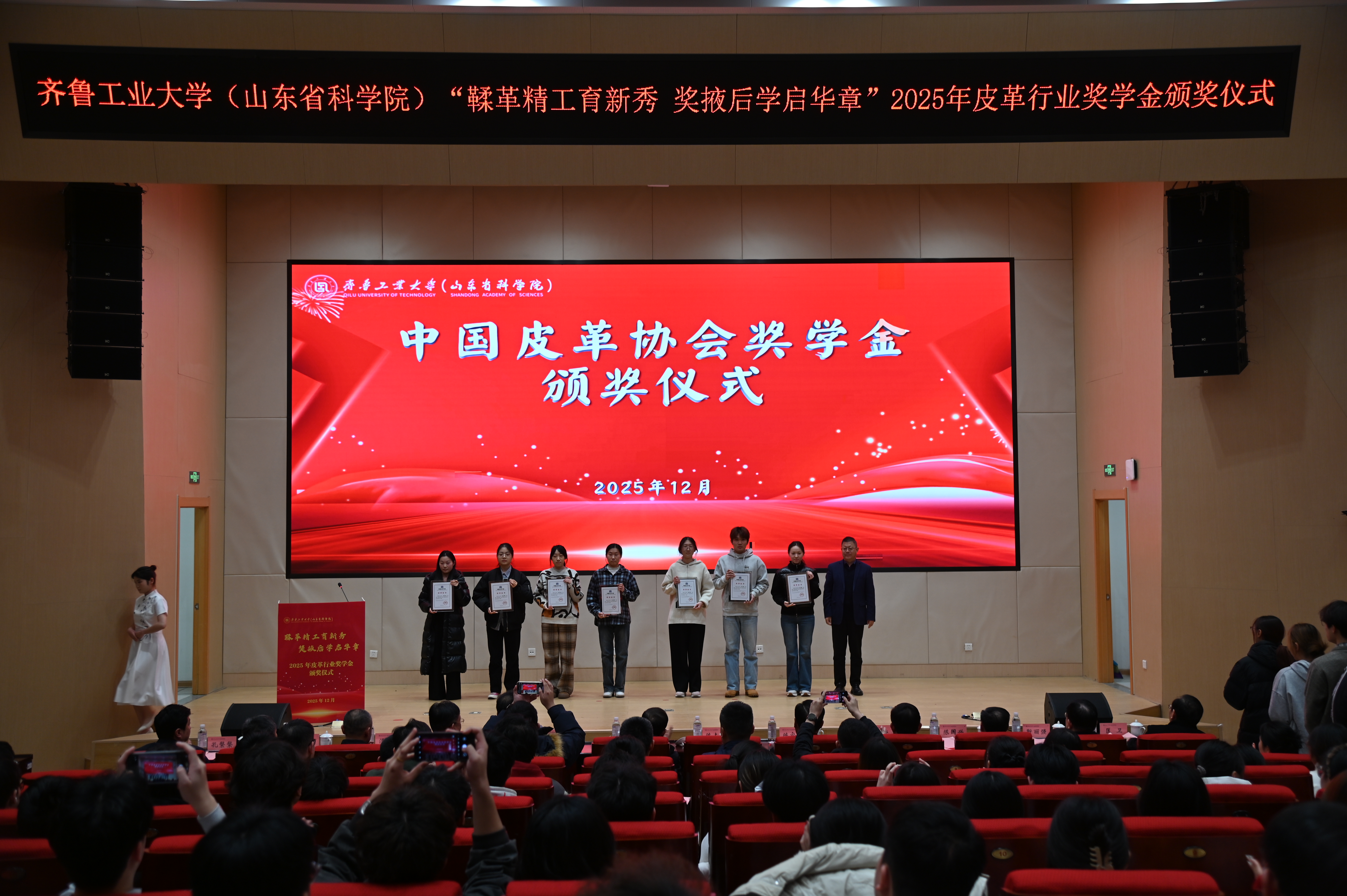 12月25日下午,齐鲁工业大学(山东省科学院)在国重楼一楼报告厅举行2025年皮革行业奖学金颁奖仪式,副校(院)长侯连涛,中国皮革协会副理事长陈占光,德州兴隆皮革制品有限公司董事长冯忠河,济南鲁日钧达皮革有限公司董事长陈家钧等出席会议,校(院)学生工作处 91香蕉视频,轻工学部,基辅学院等负责人参加会议,仪式由轻工学部党委副书记李杰主持。