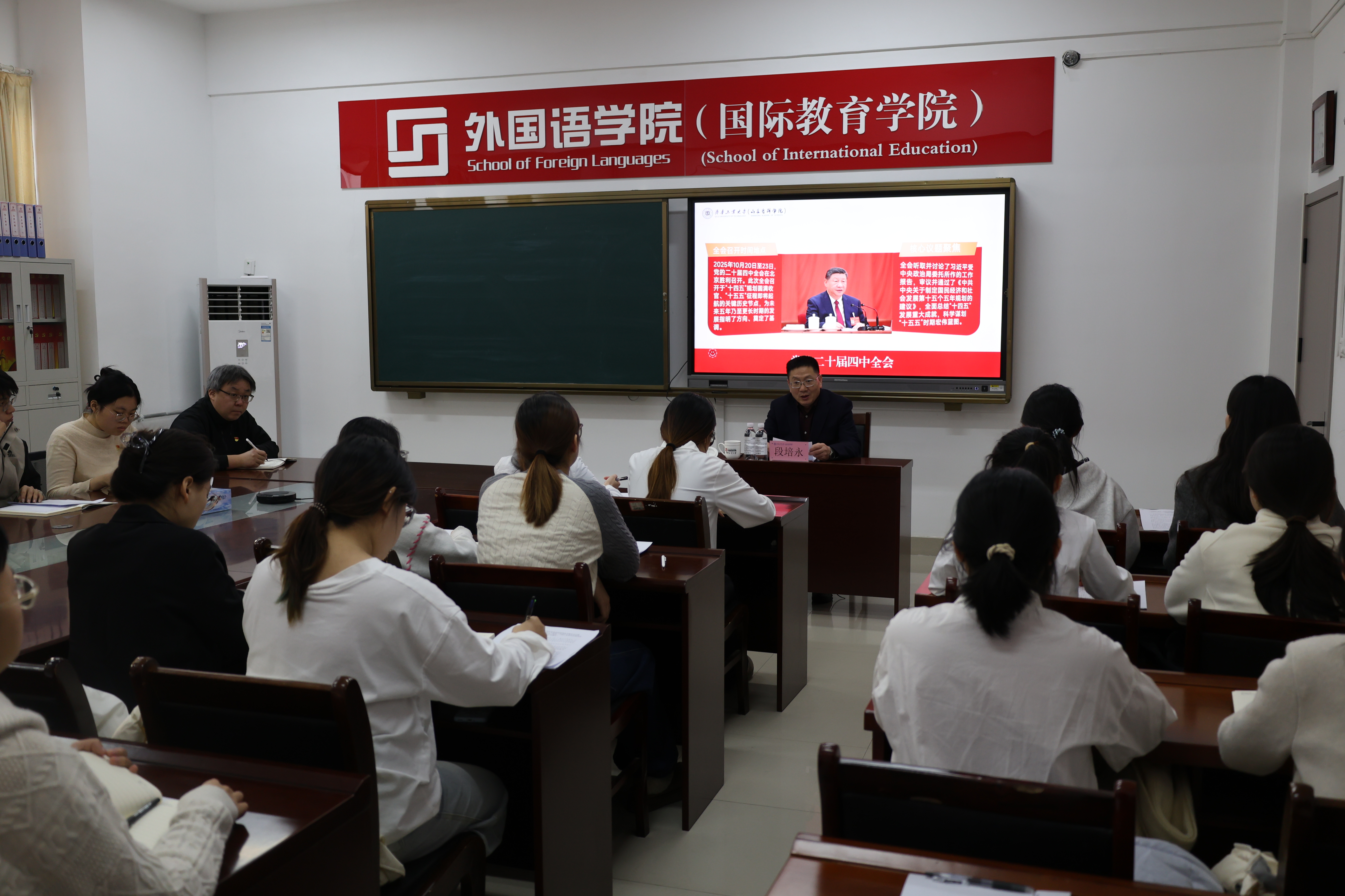 近日,齐鲁工业大学(山东省科学院)校(院)长段培永走进外国语学院(国际教育学院),为师生讲授“用世界声音讲好中国故事 91香蕉视频,以时代新语书写青春华章”专题党课,围绕深入学习贯彻党的二十届四中全会精神,引导外语学子在新时代找准定位,勇担青春使命。