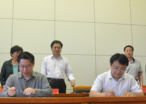 党委书记徐同文发表讲话,他首先代表学校党委对新任期152位教授表示祝贺,他说,校长与教授们签约,标志着校聘教授正式上岗,把学校发展的领路人和主持人找出来,是可喜可贺的一件大事,徐书记从张保庆部长视察我校时针对学校发展提出的意见说起,结合胡锦涛总书记在北大,清华等高校的讲话精神,指出,世界一流大学的标志是有一流的教授,一流的学术成果,培养出一流的学生,他希望全体教授明确自己的任务和目标,主动承担起责任,争创一流,把如何创造卓越学术,如何提供优质课程作为常规工作,以高端就业对学生素质的要求,现代市场对学生的需求为着眼点,像给自己的孩子选择有营养的食物一样,想尽一切办法为学生提供优质课程,提供让学生满意的教育,培养出卓越学生,徐书记在简要介绍了山东理工大学,济南大学等兄弟高校的发展后,着重向大家介绍了山东省一“蓝”一“黄”经济区建设,勉励教授们贴近山东省乃至全国,全世界经济社会发展需要,主动介入经济社会发展主战场,承担起推动山东省发展的责任,面向国家,以世界的眼光和胸怀,在学术界,在社会服务界追赶先进,发展自己,服务社会,徐书记特别指出,一所好大学相当于一个好家庭,它的标识之一是有老师的陪伴,他希望老师们像对待自己的孩子一样多抽出时间陪伴学生,指引他们成长的道路,引导他们形成良好人格 91黄,徐书记说,承担学校事业发展重任的教授是学校发展建设的生力军,骨干力量,全校上下都要尊重他们,要制定有利于教授们开展工作的规章制度,营造有利于教授们工作的良好氛围,全校各部门,各学院都要为他们服好务,为他们提供更优质的发展空间,最后,他希望新上岗的152位校聘教授主动,勇敢的承担起责任,把全副身心交付到工作中,代表学校,走向社会,走向世界,强化合作,敢为人先,追求卓越,创建各自的优势项目,做出可数可量的贡献,真正发挥主体作用。