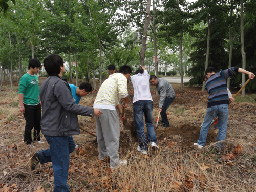 参加活动的师生挥汗如雨,密切配合,从树苗修剪、挖刨树坑到培土种植,整个过程井井有条,场面热烈,圆满完成了植树60棵的任务。