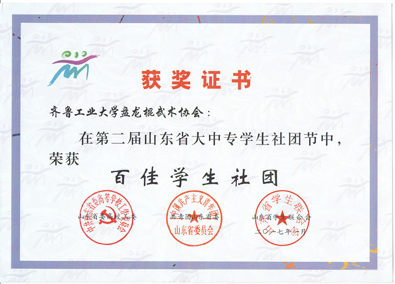 2016年,校团委为学习贯彻党的十八大和十八届三中,四中,五中全会精神,深入贯彻习近平总书记系列重要讲话精神和学校办学理念,进一步丰富学生第二课堂活动,通过加强学生社团建设,引导青年学生树立崇高理想,培养高尚道德品行,促进青年学生素质全面发展,在校党委和团省委的领导下 91香蕉,紧扣时代主题,以“齐鲁工业大学第25届科技文化艺术节”活动为载体,先后开展了歌手大赛,舞蹈大赛,小品曲艺大赛等30余项社团文化艺术活动,通过精心策划,层层选拔,最终推选了优秀作品和团队到省赛参与角逐,其中梅花桩社团提交的摄影作品《太极扇》荣获社团摄影大赛二等奖,艺术学院刘淼,姜芝林提交的软笔书法作品在社团书画比赛中荣获二,三等奖,工商管理学院代表队在啦啦操大赛中荣获三等奖,以及棋友协会,话剧社,曲艺协会等社团在相关比赛中荣获优秀奖六项,由于在整个活动期间积极配合,组织得力,最终我校团委被第二届山东省大中专社团文化节组委会评委“优秀组织奖”。