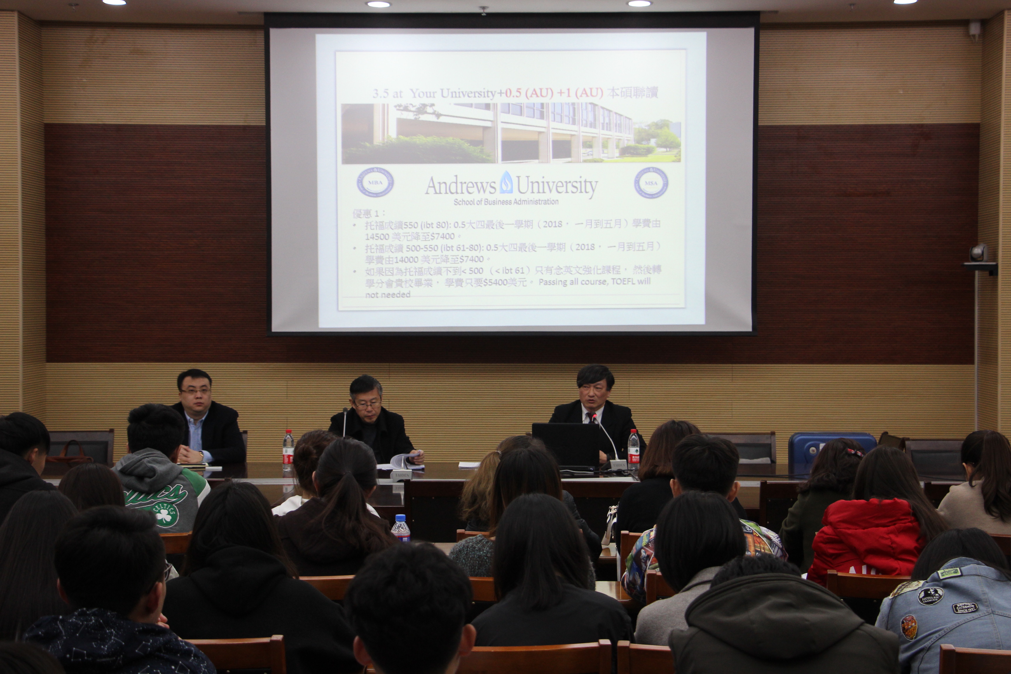 据悉,美国安德鲁大学(Andrews University,美国第一级国家大学)与我校建立友好关系,以最优惠的协议推进MBA(Master of Business Administration)项目的发展,在教学、研究、学生出国留学进修,提升竞争力等方面制定一系列合作计划。特推出面向于我校师生的四大项目:即3,5+0 91黄,5+1本硕连读计划、一年交换学生计划、访问学者计划和教师专业或英文培训计划。。