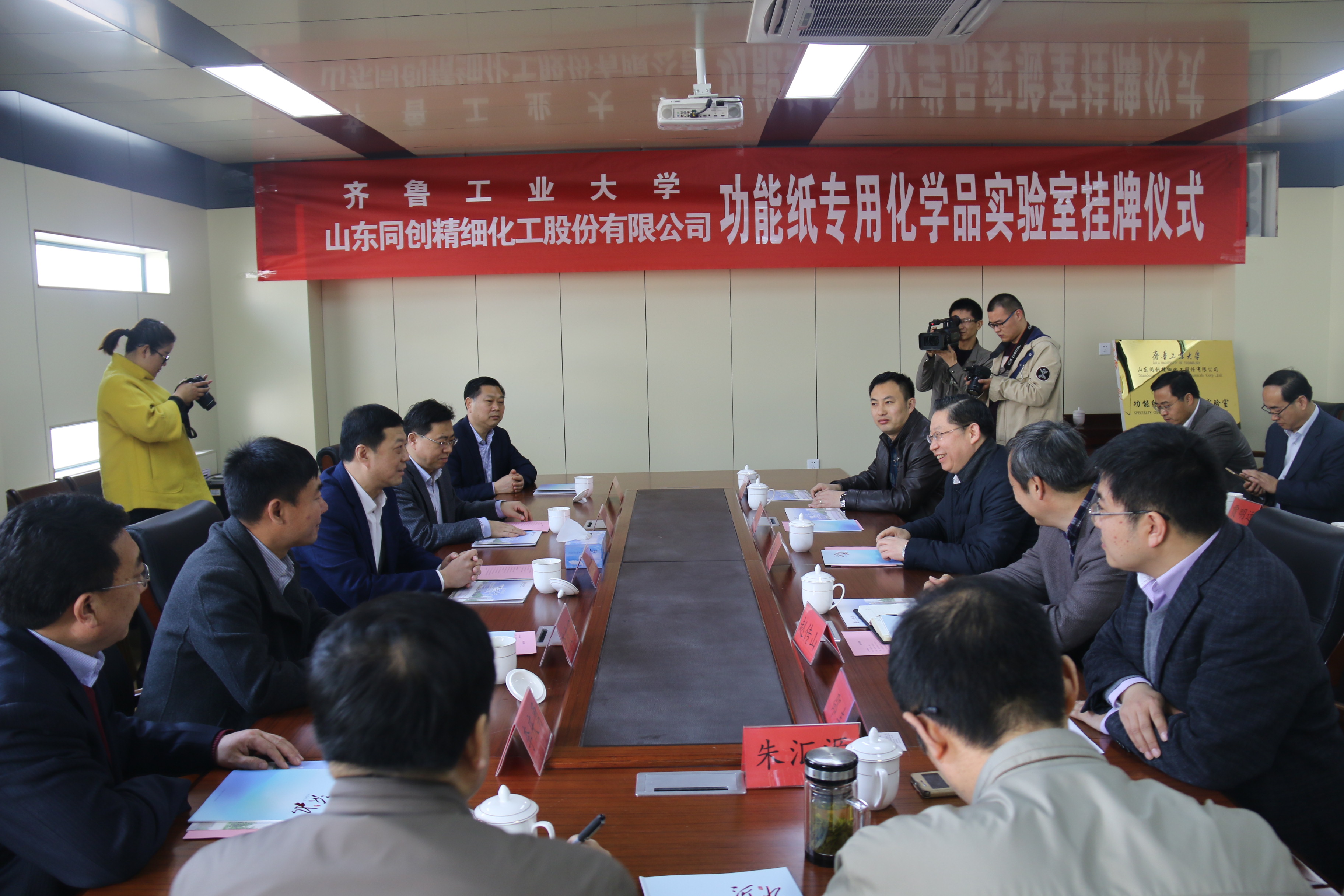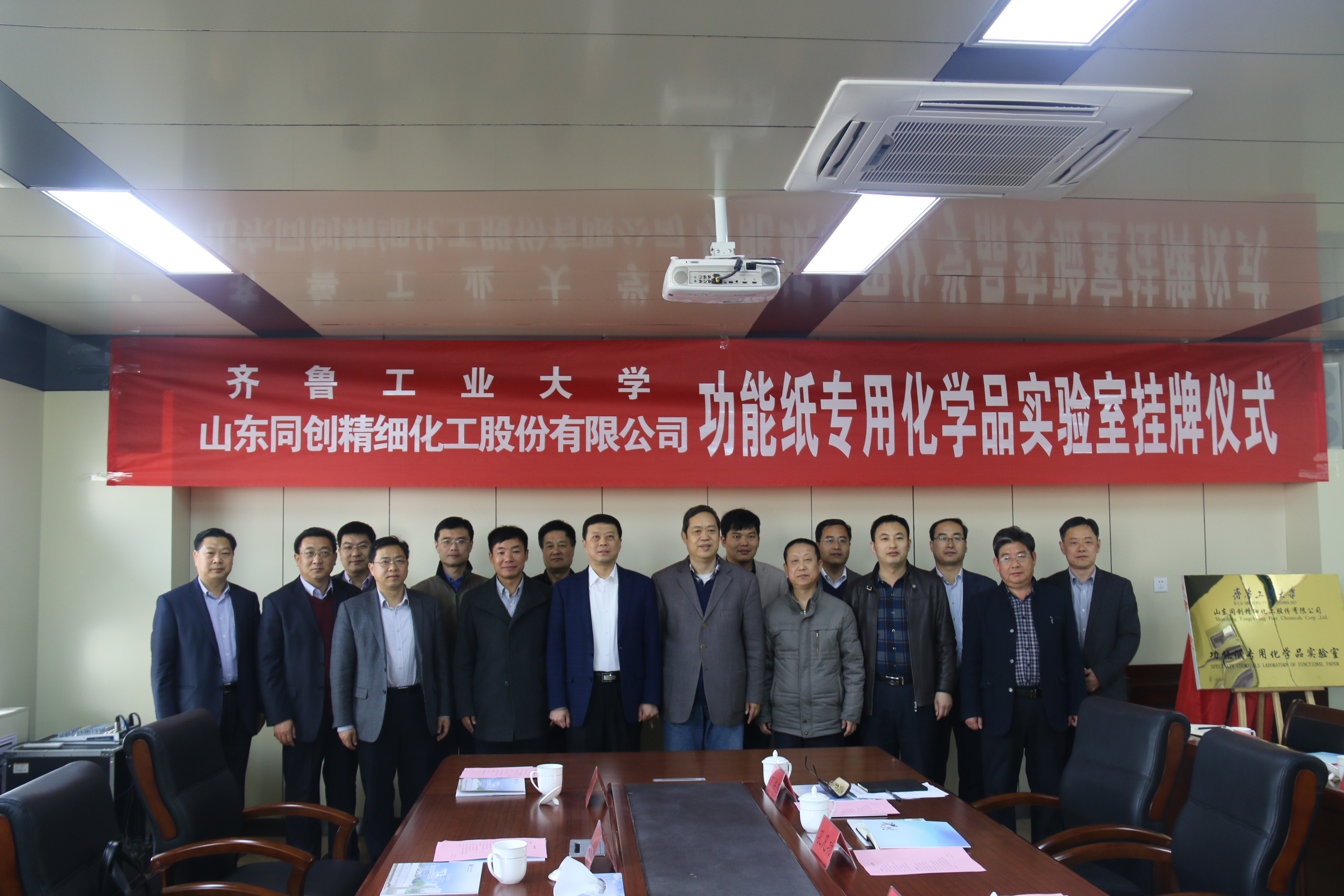 3月17日,齐鲁工业大学与山东同创精细化工股份有限公司共建“功能纸专用化学品实验室”揭牌仪式在2号教学楼320室举行,校长陈嘉川,沂水县县长陈永生 91香蕉视频,常务副县长陈海龙,同创精细化工董事长李庆同,轻工学部,造纸与植物资源工程学院和沂水县相关部门负责人出席了揭牌仪式,轻工学部部分教师,研究生代表参加了仪式,仪式由造纸与植物资源工程学院副院长丁洪杰主持。