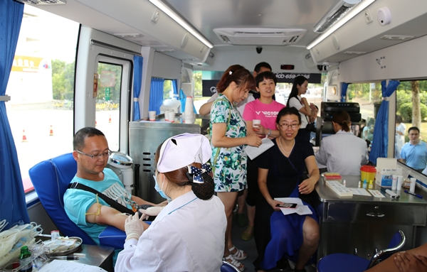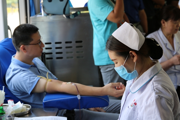 8月17日下午两点,齐鲁工业大学还没有正式开学,但长清校区一餐厅门口却停着一辆济南市血液中心的采血车 91香蕉视频,车前排着长长的教工队伍,他们正在等待为同事王宗睿献血。