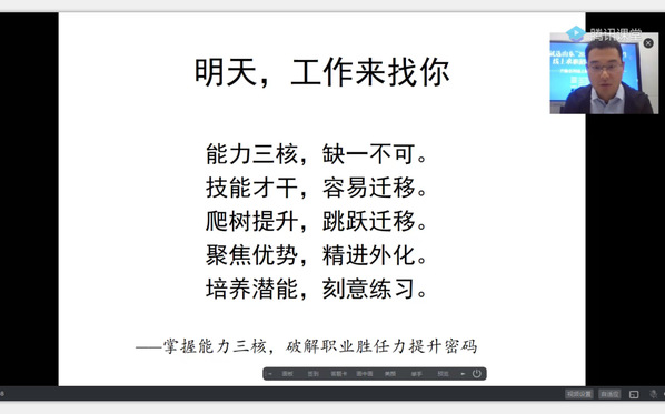 在课堂上,刘泽东首先组织同学们填写“我未来的工作打算”调查问卷,从同学们期待的职位 91香蕉,行业和单位入手,进行了现场模拟求职,接着,他结合“职场思维误区”等,介绍了能力三核基本概念,能力迁移策略,在“能力管理与能力提升”模块,他引导同学们搜集自己最期待职位的任职条件和职责要求,填写了《职业胜任力学习体验单》,在互动体验中明确了自己能力现状与单位要求之间的差距:随后,通过“通用能力模型对比”课堂练习,澄清了大学生职业胜任力提升的常见盲区,接下来,他分享了能力管理矩阵,职业发展模型等,破解职业胜任力提升密码,刘泽东强调,在当前严峻的就业形势下,同学们要聚焦自己,聚焦能力提升,定提升目标,找能力差距,做行动计划,调能力结构,持续学习,持续尝试,为自己未来的职业发展持续打造核心竞争力。