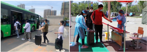 接站车陆续载着更多的学子回到阔别已久的校园 91看片,学生下车后保持两米距离排队入校.