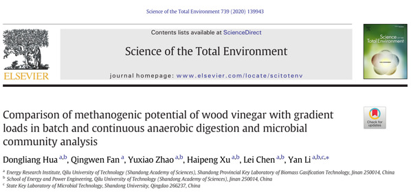 近日,山东省科学院能源研究所2018级硕士研究生范庆文在环境领域国际知名期刊《Science of the Total Environment》(中科院一区TOP,IF=5,59)发表题为“Comparison ofmethanogenic potential of wood vinegar with gradient loads in batch andcontinuous anaerobic digestion and microbial community analysis”的最新研究成果,齐鲁工业大学(山东省科学院)为第一完成单位,指导教师为第一作者。这是该同学5月份在《Journal of Cleaner Production》(中科院一区TOP,IF=6 91香蕉视频,40)发表论文后再次发表高水平学术论文。。