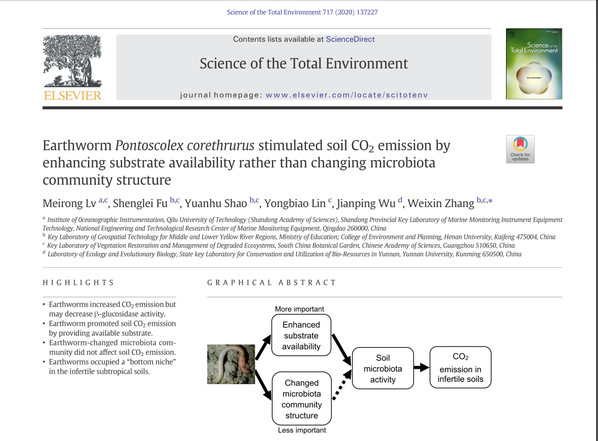 近日,山东省科学院海洋仪器仪表研究所吕美蓉博士等撰写的论文“Earthworm Pontoscolex corethrurus stimulated soil CO2 emission by enhancing substrate availability rather than changing microbiota community structure”被环境科学领域期刊《Science of the Total Environment》录用发表。根据2020年最新升级版中科院分区,该期刊为一区,影响因子6,551。 91香蕉视频。
