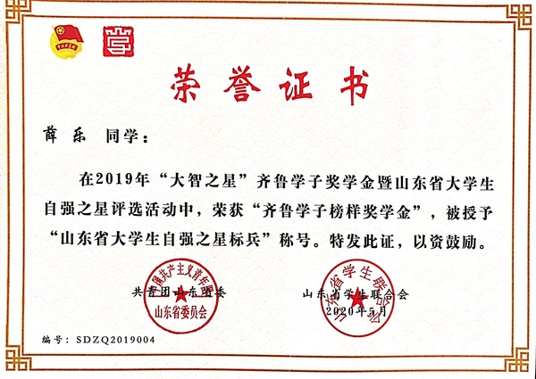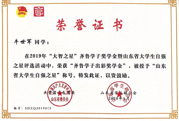 2019年度“大智之星”齐鲁学子奖学金评选活动自6月启动后,校(院)团委认真发动,精心组织,通过学生自主报名,校(院)初评,专家评选等环节的层层选拔,推选出薛乐和牛世军两名同学参加了省级评选,经过激烈的竞争,最终在200余名选手中脱颖而出 91香蕉,荣获含金量最高的两项荣誉。