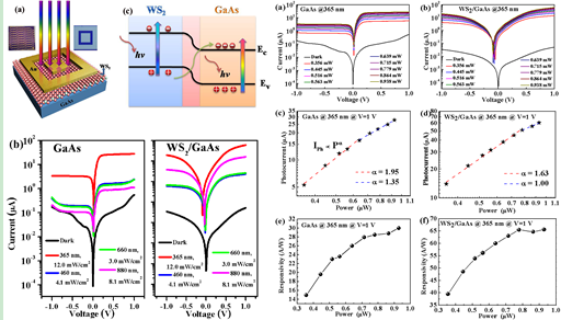 该工作基于传统的GaAs半导体衬底构筑了WS2/GaAs异质结并成功制备了自驱动、高响应度光探测器,该探测器在内建电场作用下不需外加电压即可驱动,在365 nm波段的响应度达到65,58 A/W,相较于GaAs探测器的30 91香蕉,04 A/W提高了一倍以上,同时在880 nm波段的响应度达到28,50 A/W。此外该探测器表现出优异的噪声性能和光探测能力,其NEP(Noise Equivalent Power)达到1,97 × 10−15 W∕HzI∕2, Detectivity 达到4,47 × 1012 Jones。该项工作为进一步提高传统探测器的性能提供了潜在的有效途径。。