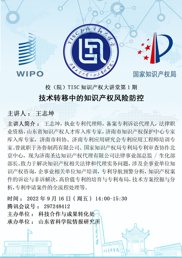 校(院)TISC知识产权大讲堂第1期:技术转移中的知识产权风险防控