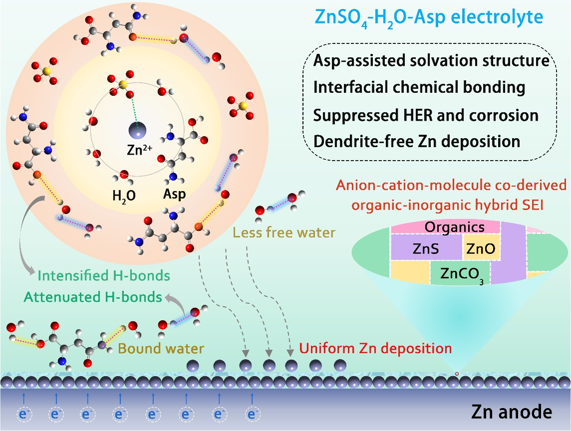 水系锌离子电池具有安全性高、成本低、高离子电导率等优点而受到了广泛的关注。金属锌作为水系锌离子电池的负极材料,具有理论容量高(820 mAh/g 或5855 mAh/cm3)、工作电位低(-0,76 V vs,SHE)、市场价格低廉等优点。然而,锌枝晶的生长、析氢反应和电解液的腐蚀阻碍了锌负极的进一步应用。本研究采用了L-天冬酰胺(Asp)作为硫酸锌电解液的添加剂稳定锌金属负极界面。研究发现,添加剂的引入重塑了电解液中Zn2+的溶剂化结构;此外,与水分子相比,Asp分子优先吸附在锌金属表面,表现出了强烈的化学吸附作用,形成了新的化学键。进一步的研究发现,循环后的锌金属表面原位生成了富ZnO-ZnCO3-ZnS的固体电解质界面(SEI),有效地保护了锌负极免受析氢反应和腐蚀的影响,实现了均匀致密的锌沉积,从而输出了优异的电化学性能,包括高库伦效率、高Zn利用率下优异的循环性能和实用条件下的全电池循环。 91香蕉。