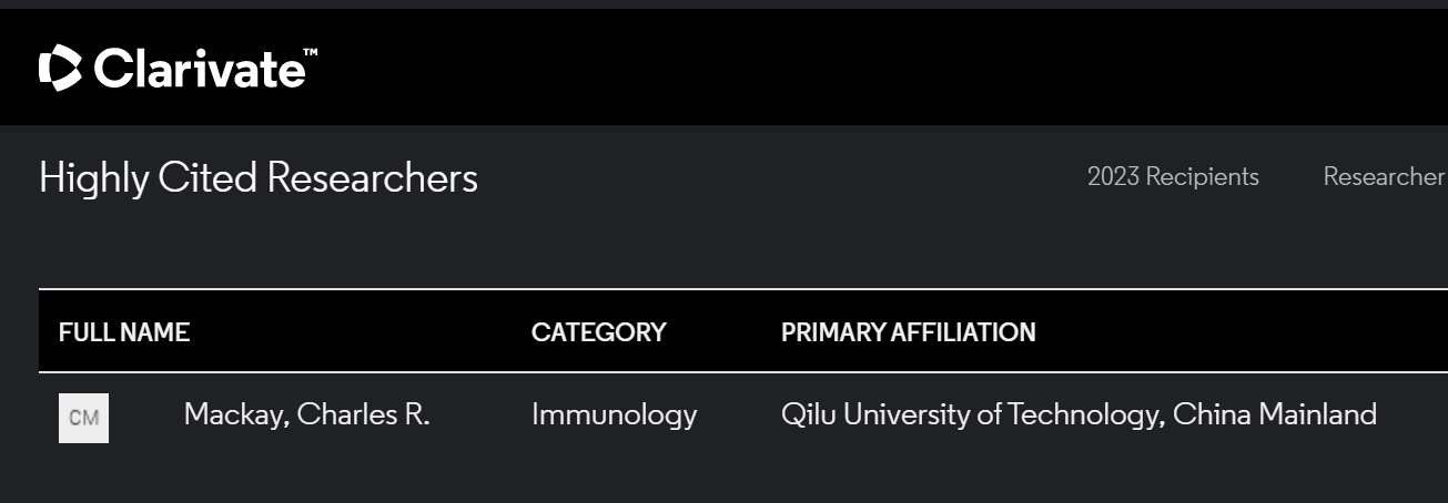 近日,世界领先的科研信息和知识产权服务企业科睿唯安(Clarivate)发布了2023年度“全球高被引科学家”名单,表彰在全球科学领域作出卓越贡献的杰出学者,齐鲁工业大学(山东省科学院)药学院名誉院长,化学与制药学部免疫药理学团队学术带头人查尔斯·麦凯院士 91香蕉视频,凭借其在免疫药理学基础研究领域的杰出表现入选该项榜单。