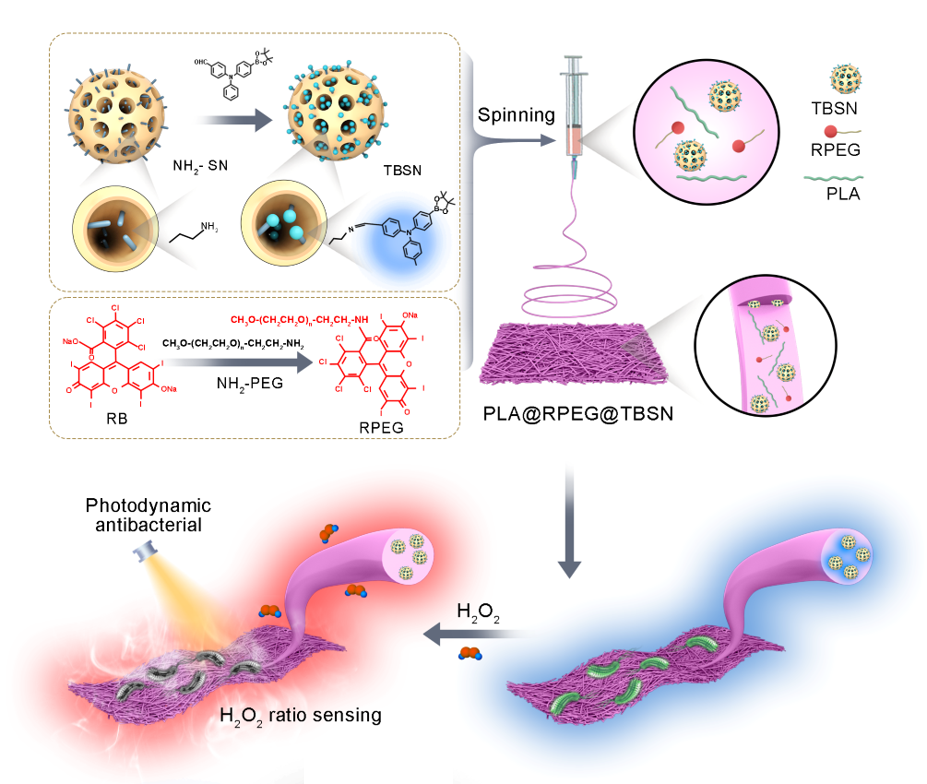团队利用具有聚集诱导发光(AIE)性能的介孔二氧化硅荧光纳米探针(TBSN)结合孟加拉玫瑰红修饰的聚乙二醇(RPEG)通过静电纺丝技术,制备出具有H2O2传感以及光动力抗菌性能的聚乳酸/聚乙二醇/二氧化硅纳米粒子杂化膜(PLA@RPEG@TBSN),基于比率的荧光变化,柔性PLA@RPEG@TBSN传感器实现了对H2O2蒸汽的高精度,高灵敏度以及实时可视化的检测(图1),其检测限低至7 ppb,此外由于含光敏剂聚合物的掺入,PLA@RPEG@TBSN表现出优异的光动力抗菌活性,用于口罩上可以在保持有效气体H2O2传感的同时,充分拦截和杀死空气中传播的细菌气溶胶,实现抗菌-传感一体化作用(图2),这一设计策略在开发高效稳定的智能气体传感器和可穿戴设备,特别是与气体传感和健康保护相关的应用中具有巨大的前景 91黄。