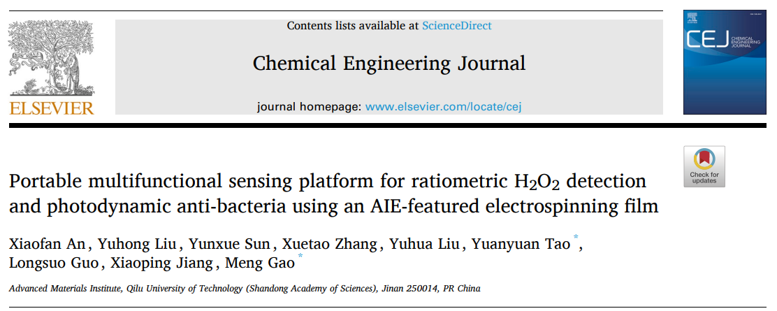 近日,材料科学与工程学部先端材料创新团队在《Chemical Engineering Journal》(中科院一区,TOP期刊,IF=15,1)上,发表了柔性多功能H2O2气体传感材料方面的研究成果“Portable multifunctional sensing platform for ratiometric H2O2 detection and photodynamic anti-bacteria using an AIE-featured electrospinning film”。齐鲁工业大学(山东省科学院)材料学部2021级研究生安晓帆为文章的第一作者,高萌副研究员和陶圆圆助理研究员为文章的通讯作者。 91香蕉视频。