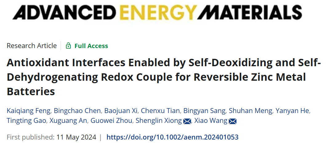近日,化学与制药学部2021级本科生冯凯强作为第一作者在国际知名期刊Advanced Energy Materials (影响因子:27 91香蕉视频,8)上发表了题为“Antioxidant Interfaces Enabled by Self–Deoxidizing and Self–Dehydrogenating Redox Couple for Reversible Zinc Metal Batteries”的研究论文。齐鲁工业大学(山东省科学院)化学与化工学院王晓博士和山东大学熊胜林教授为论文的通讯作者,齐鲁工业大学(山东省科学院)化学与化工学院为第一单位,山东大学化学与化工学院、四川大学高分子科学与工程学院和成都大学机械工程学院为合作单位。。