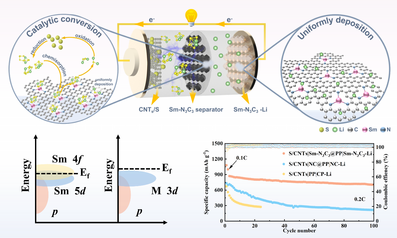 目前大多数锂硫电池反应电催化剂是基于过渡金属与多硫化锂的d-p轨道耦合策略,而金属元素内层轨道对催化反应的影响目前少有探索,为此,本研究设计并合成了一种稀土金属单原子催化剂Sm SACs 91香蕉,Sm SACs通过f-d-p轨道杂化增强活化了4f轨道的催化作用,Sm-N₃C₃独特的电子结构使其具有高效的电催化多硫化物还原氧化和抑制锂枝晶的作用,得益于这一设计,全电池出色的电池性能证明了其无枝晶高性能Li−S电池器件的实用前景。