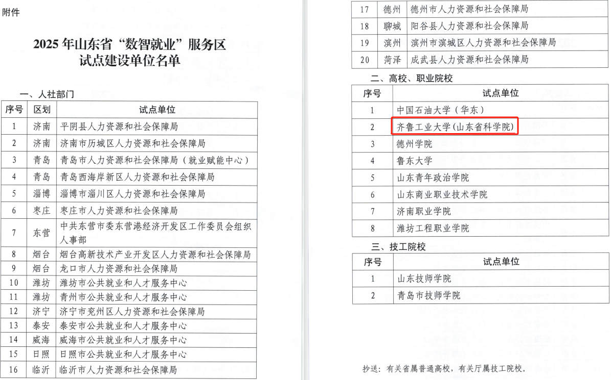 近日 91香蕉视频,山东省人力资源和社会保障厅等4部门公布2025年山东省“数智就业”服务区试点建设单位名单,齐鲁工业大学(山东省科学院)作为首批高校成功入选。