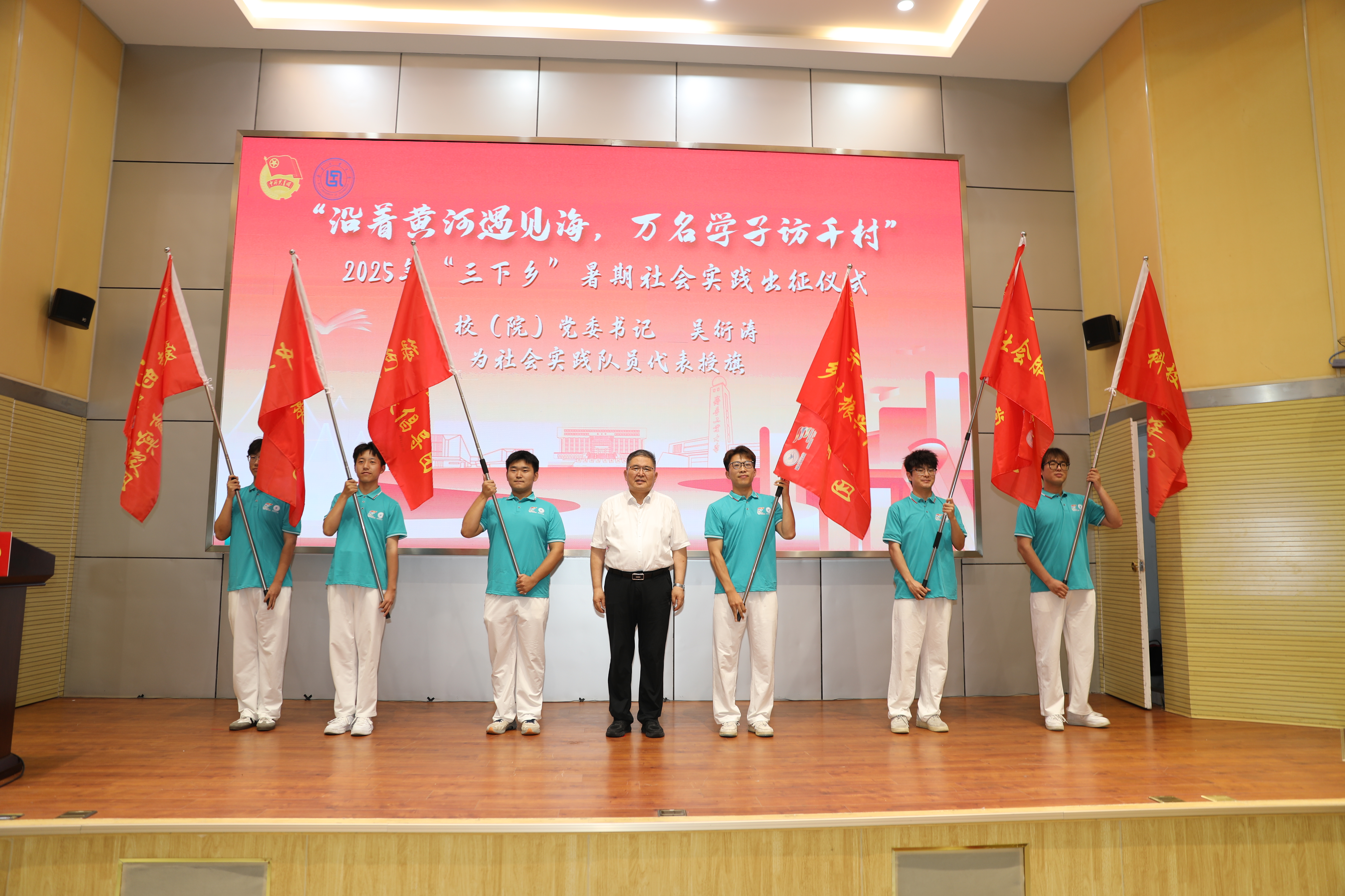 7月8日下午 91香蕉视频,齐鲁工业大学(山东省科学院)“沿着黄河遇见海 万名学子访千村”2025年暑期社会实践出征仪式在长清校区办公楼报告厅举行,校(院)党委书记吴衍涛,副校(院)长乔丙武出席仪式,宣传部,学生工作处(武装部),团委,研究生处,文化产业研究院等部门负责同志参加仪式,仪式由学生工作处(武装部)处长(部长),团委书记万金存主持。
