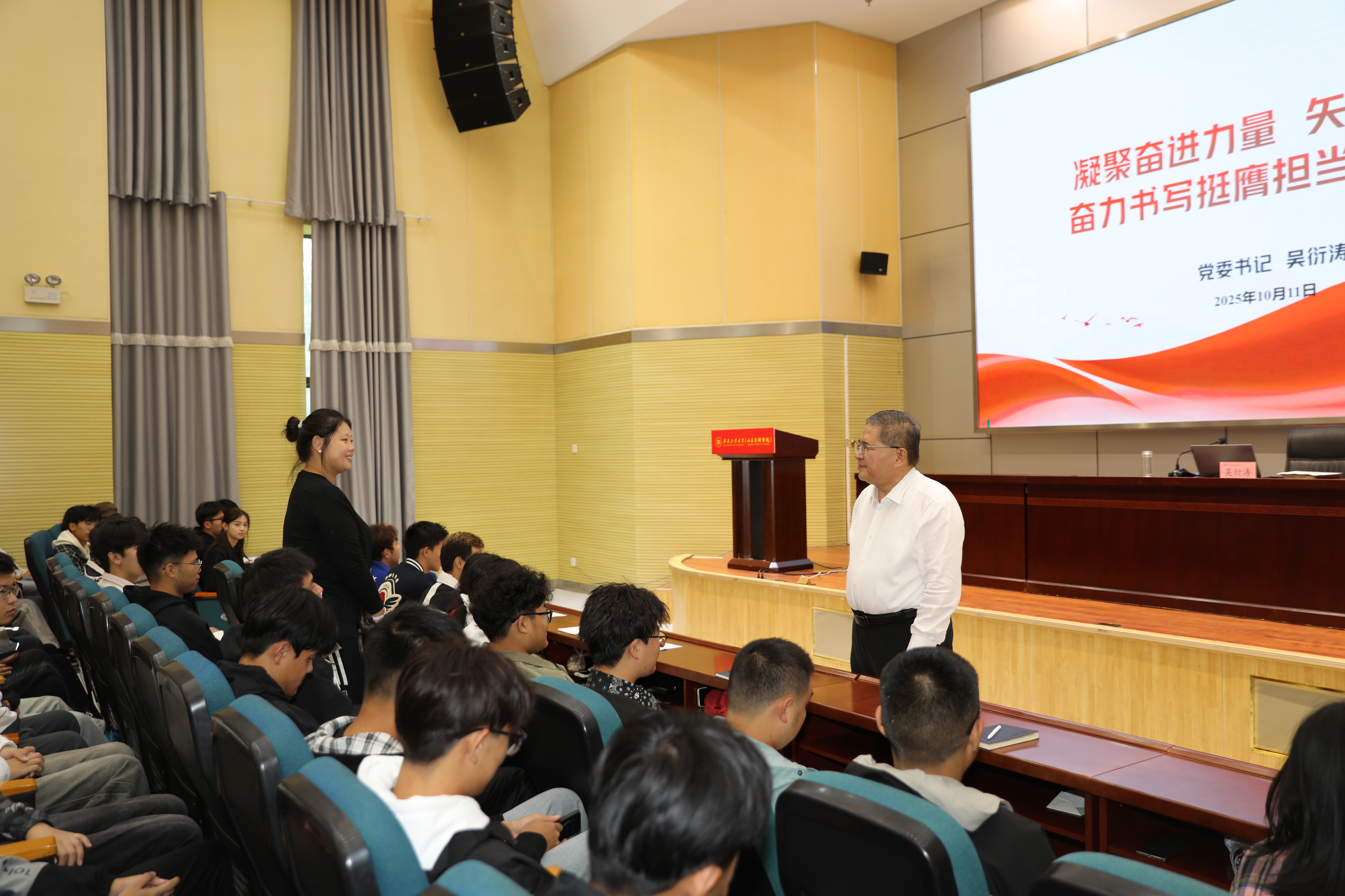 10月11日,齐鲁工业大学(山东省科学院)党委书记吴衍涛以“凝聚奋进力量 矢志强国复兴 奋力书写挺膺担当的青春篇章”为题为青年学生讲授了一堂鲜活而深刻的思政课 91香蕉视频,校(院)材料学部,控制学部300余名学生代表进行了现场聆听。