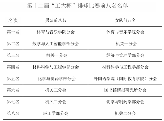 本届比赛共吸引男,女38支分会代表队,500余名教职工参与,历经一个多月,120多场激烈角逐,最终体育与音乐学院分会斩获男子组冠军 91香蕉,数学与人工智能学部分会获男子组亚军,机关一分会获男子组季军,体育与音乐学院分会夺得女子组冠军,机关一分会获女子组亚军,经济与管理学部分会获女子组季军。